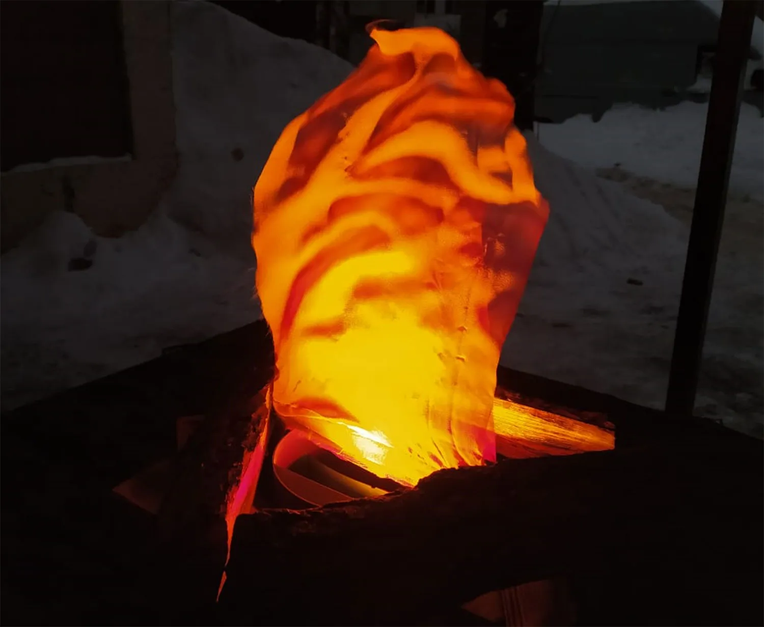 Принцип работы изделия крайне прост: кусок ткани (два куска тончайшего шелка) крепятся над небольшим вентилятором. Цветные светодиодные лампочки освещают ткань, развевающуюся в направленном потоке воздуха вентилятора. Сочетание движущейся над костром ткани и цветной LED-подсветки создаёт на сцене весьма реалистичный эффект пламени…